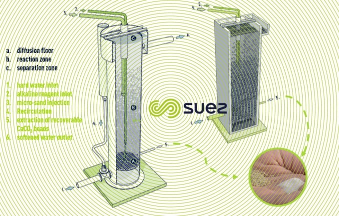Softazur® C (formerly known as Gyrazur) is a fluidized bed upflow reactor designed for catalytic carbonate removal. In this process, the decarbonation of hard water (>30°F) is achieved through chemical precipitation on a bed of calcium carbonate pellets.
