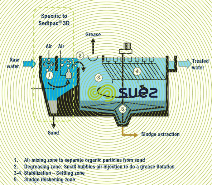 - Sedipac® 3D combines in a single device the functions of sand removal, grease removal and primary settling. It is installed directly after the screening.