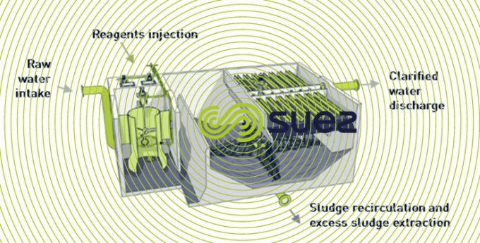 It combines the principle of lamellar settling with an integrated sludge thickener. There is no need of downstream additional sludge thickening equipment before dewatering. The densification of sludge allows to reduce the volume of extracted sludge and thus limit the water loss.