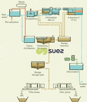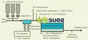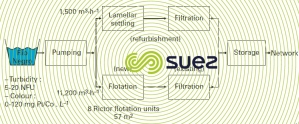 Figure 44. - Installation diagram of the Lisbon-Asseicera DWTP (Portugal). Capacity: 375,000 m3· d–1. Maximum: 500,000 m3· d–1. Remineralisation using CO2 injection – lime injection