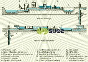 Figure 18. - Diagrams of the Croissy-sur-Seine recharging plant (capacity: 136,800 m3· d–1) and polishing of aquifer water (Pecq plant – Capacity: 146,400 m3· d–1)