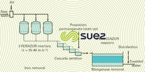 Figure 35. - Schematic diagram of the Mommenheim DWTP for the Hochfelden water board (Lower Rhine, France). Capacity: 500 m3· h–1 capable of extension to 650 m3·h–1. Biological iron and manganese removal