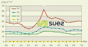 Figure 29. - Changes in oxygen requirements in each of the cells during a dry weather day (1st or 2nd day)